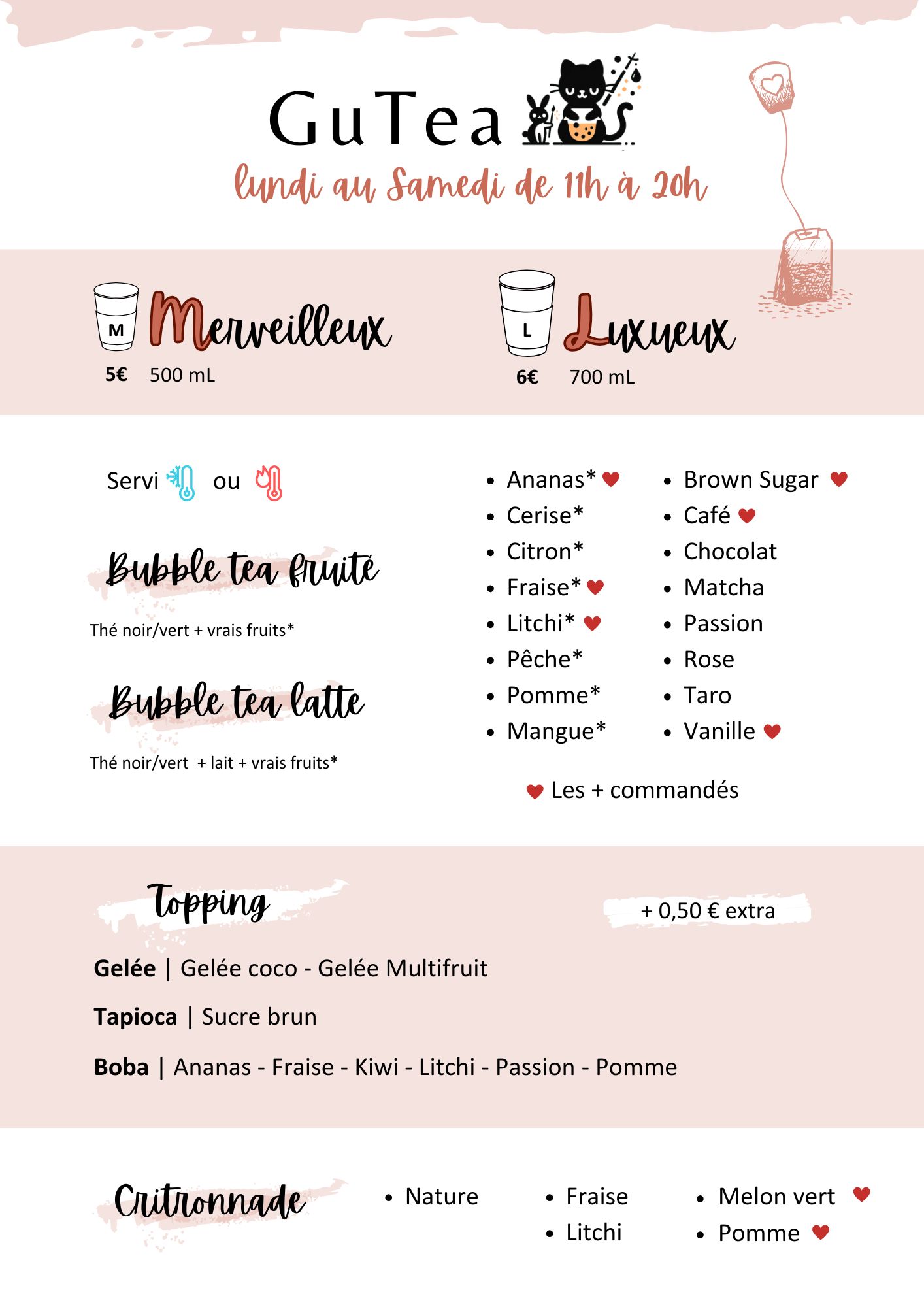 GuTea est un lieu où chaque boisson est pensée pour faire plaisir, sans culpabilité, ni frais cachés. Que vous soyez fan de café ou amateur de bubble tea, vous trouverez chez nous un moment de gourmandise à prix doux.